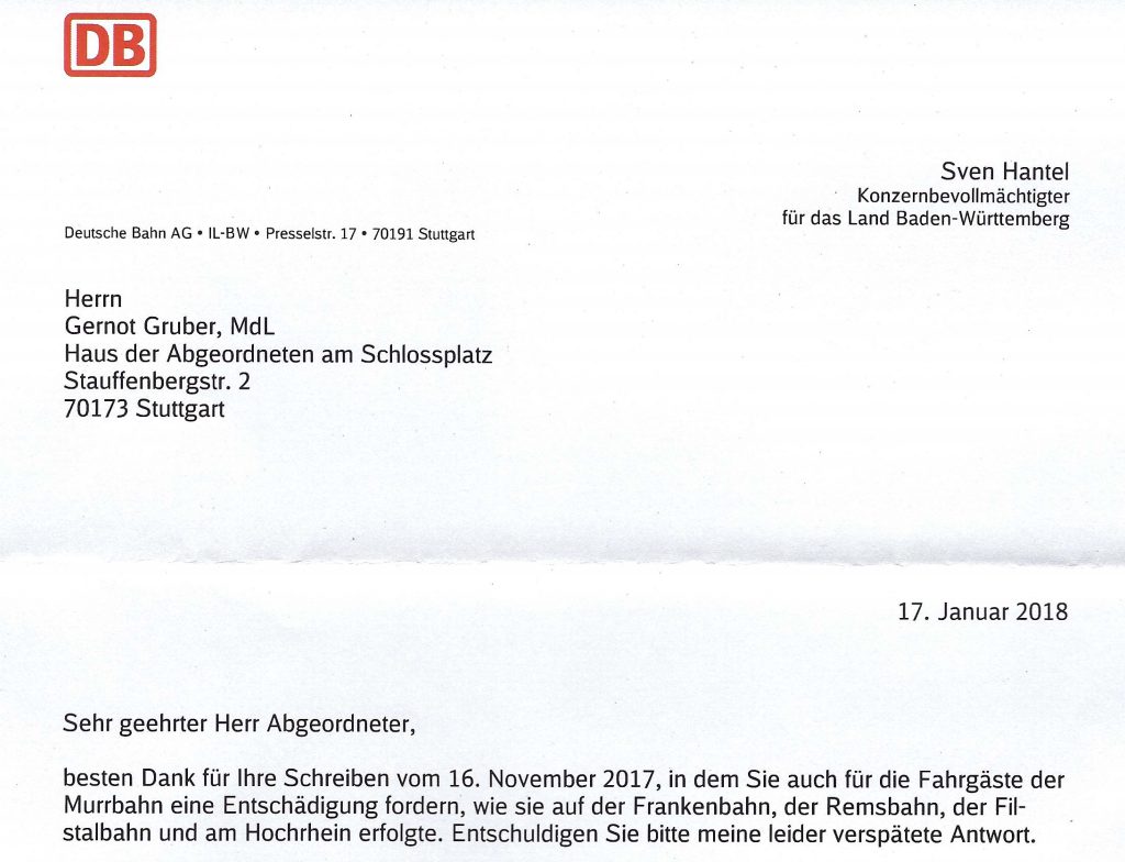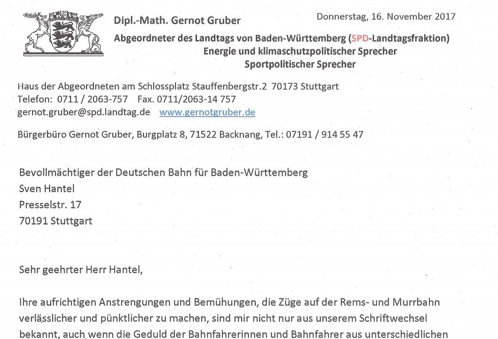 Gruber hatte Ende letzten Jahres darauf hingewiesen, dass in den ersten drei Quartalen sechs von hundert Zügen auf der Murr-Strecke ausgefallen waren und weitere 2,4 Prozent in und ab Stuttgart über eine Viertelstunde Verspätung hatten – deutlich mehr als auf Strecken, auf denen Jahreskartenbesitzer eine Entschädigung erhalten haben. Das will der Bevollmächtigte aber nicht gelten lassen. Er beruft sich auf die hauseigene Statistik, in der Ankunft und Abfahrt in Stuttgart nicht maßgeblich sind. Gemittelt über alle Bahnhöfe schneide die Murr-Bahn vergleichsweise ordentlich ab.
